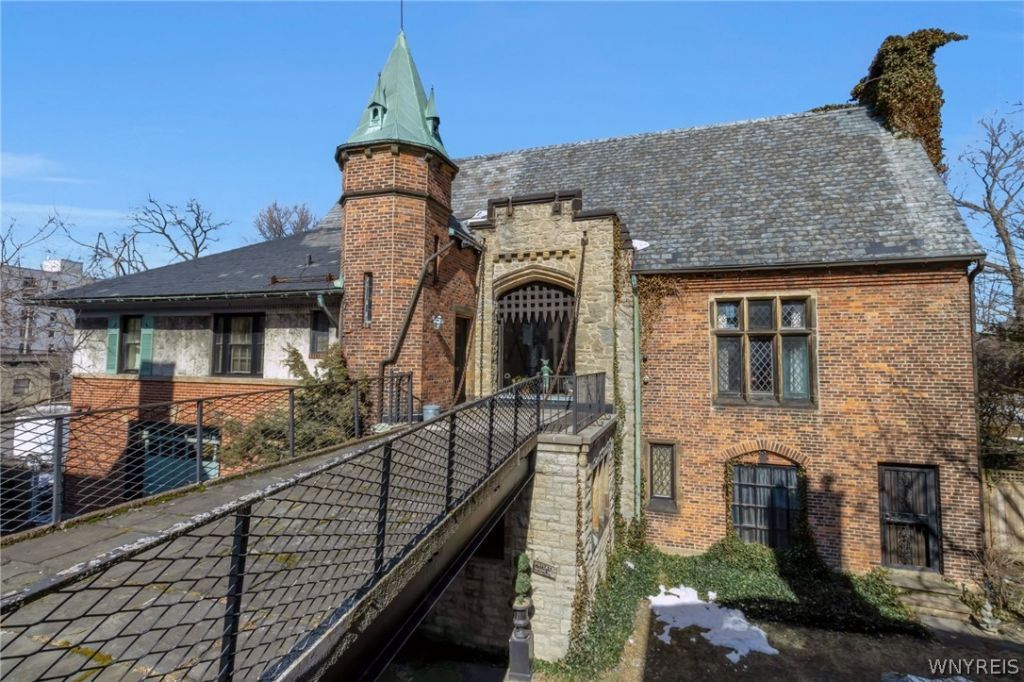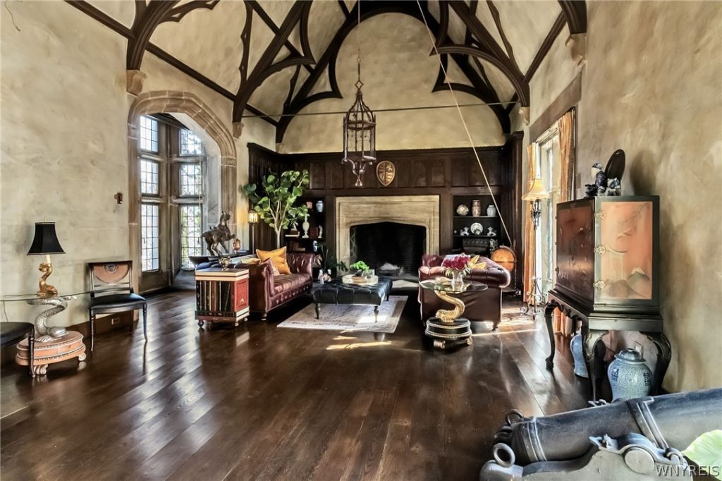 A rare architectural treasure, The Castle at Mayfair Lane was masterfully designed by noted architect E.B. Green, whose work helped define the character of many prominent early 20th-century estates. This extraordinary residence was conceived in the spirit of a 17th-century English manor, blending authentic Old World craftsmanship with enduring architectural significance. The exterior showcases hallmark medieval influences, including a grand stone archway, quatrefoil windows, and carved lion motifs-details emblematic of Gothic Revival design. The home's commanding presence evokes the charm of an English village while remaining prominently situated within the city. At the heart of the residence is the dramatic two-story Great Room, distinguished by a monumental stone fireplace, intricate wood paneling, and rare carved Gothic trusses reclaimed from an 17th-century abbey-an exceptional and irreplaceable historic feature. Floor-to-ceiling windows, birdcages crafted and hand-painted in Paris in the 1890s, a musician's loft, and a built-in koi pond further enhance the architectural narrative of this remarkable space. The first floor continues the tradition of formal yet functional design, offering an eat-in kitchen with pantry, formal dining room, family room with fireplace and garden access, and laundry. The second level includes four bedrooms and 2.5 baths, along with the Great Room overlook. A top floor guest suite with full bath provides additional accommodation. Complementing the historic interiors is a private landscaped yard with a saltwater in-ground pool, seamlessly integrating modern amenities with timeless design. Featuring 5 bedrooms, 3 full and 2 half baths, a finished basement, and preserved period architectural elements throughout, this distinguished residence represents a rare opportunity to steward a piece of architectural history.